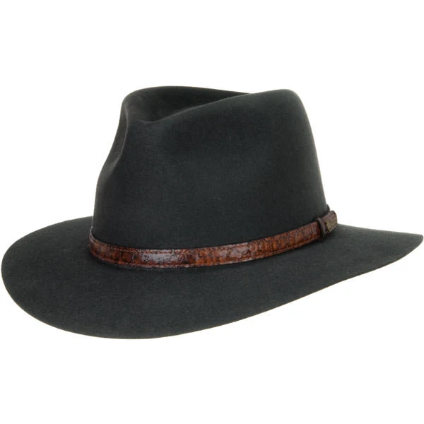 Akubra Banjo Parterson Hat is included in the Akubra Heritage Collection of fine quality hats Made in Australia. The Banjo Paterson is named after the acclaimed Australian writer/poet of the same name. Made of the finest fur felt, this beautiful hat features a 4 1/2″ crown at the front pinch and a 2 3/4″ brim. The unique hat band is made from Barramundi, an Australian fish, and has a smooth shiny finish with a marbled quality. Fully lined with a reeded roan leather sweatband. This hat is rated UPF 50+ so in addition to looking nice it has the highest level of sun protection possible. Handmade in Australia.