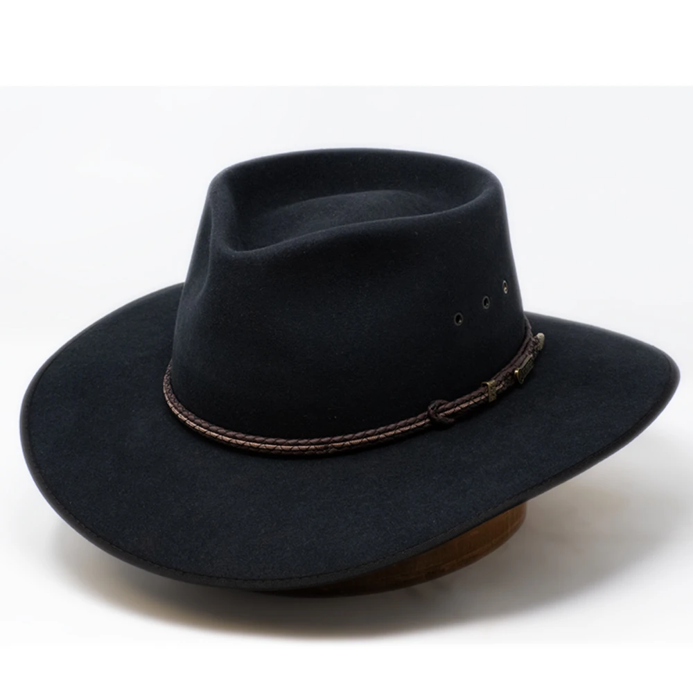 The Akubra Cattleman is made from Akubra’s Imperial Quality pure fur felt, and says a lot about its wearer. The Cattleman is produced for the Australian Cattleman’s Hall of Fame, chosen because it represents the hats used by the cattle workers in Australia. This rugged, enduring Australian style is a good choice for anyone spending time outdoors due to its UPF 50+ rating – the wide brim will shield your nose, ears and neck from the sun. The pinch-front teardrop crown is 4 inches high, with eyelets on each side for ventilation. The 3 1/4″ brim is bound with ribbon and is turned down in front and back, also called “safari style”. It has an ornamental band with brass fittings and is fully lined with a genuine leather sweat band. Made in Australia with care.