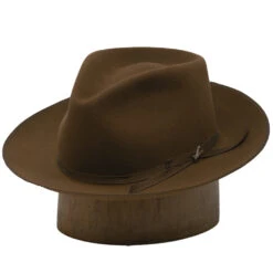 The Bailey Colver Felt Fedora is a sturdy, stiffened elite finish wool felt fedora, made to hold its unique shape and stay looking good for years. A raised front teardrop crown has a striking profile, paired with a trendy flat 3 inch brim bound with the same Japanese grosgrain ribbon as the hat band. A vintage flooring nail detail is a rustic touch. The interior is fully lined, with a Dri Lex comfort sweatband. Made in the USA