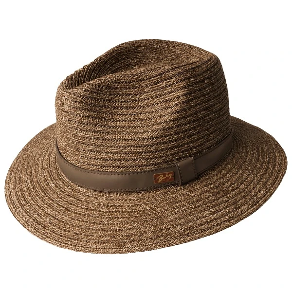 The Bailey Foley Braided Straw Fedora combines the delicate look of finely woven straw with the durable, flexible feel of Litestraw for a hat made for summer. A casual grad crown, slightly sloped down on both front and back, meets a generous 2 3/4 inch downturn brim finished with a rich leather band. Bailey tab on the leather band.