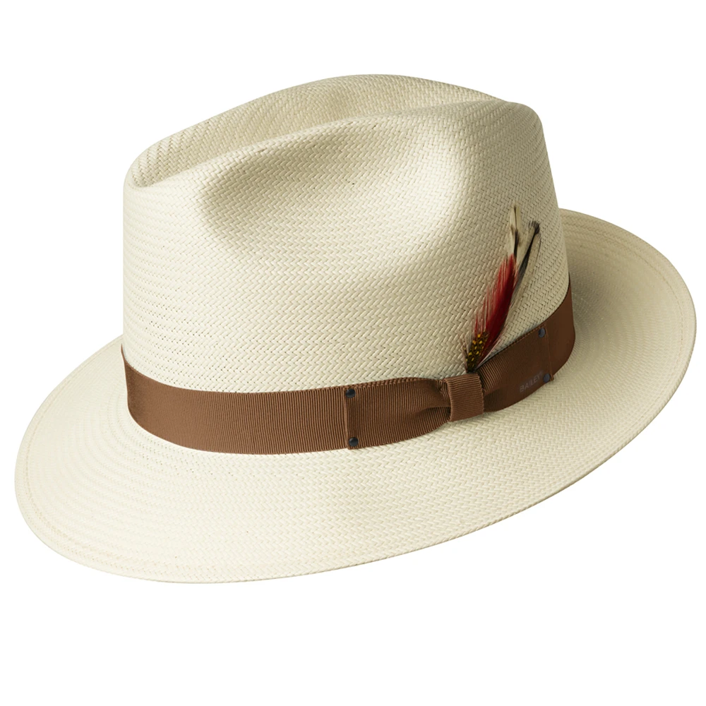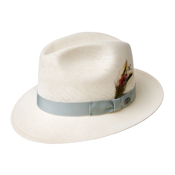 The Bailey Hanson Shantung Hat is a light Shantung fedora with a center dent crown and 2 1/2 inch snap brim. A crisp classic look, this hat is finished with a slim ribbon hat band and a removable feather. A smart choice for summer. Made in the USA.
