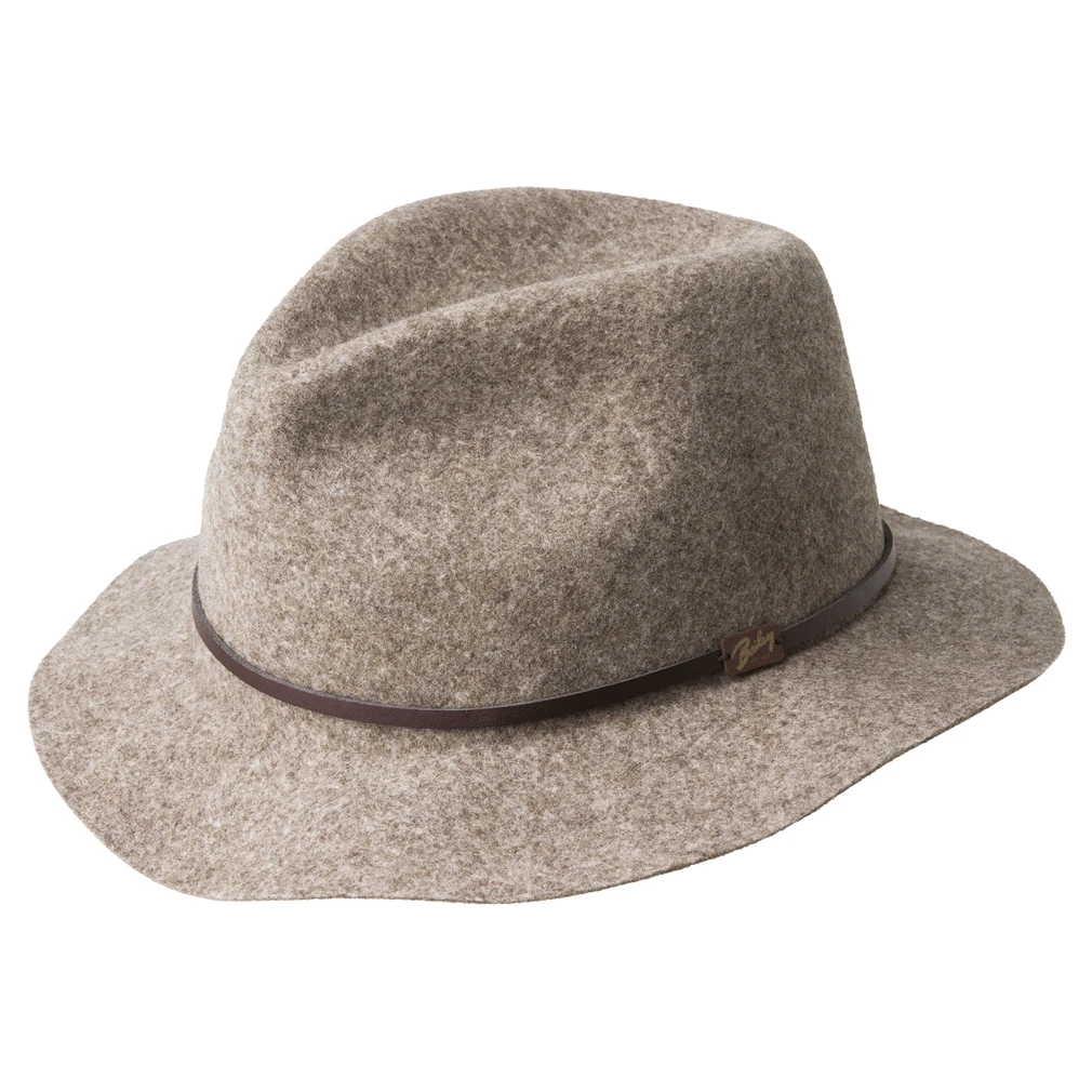 The Bailey Jackman Hat is a perfect hat for travel. Made of lightweight soft wool, this fedora crown hat has a 2 1/2 inch casual brim and thin hat band. The hat is packable, crushable, and comes with a carry bag for easy storage. Roll it up and bring it along- this comfortable fedora is fashionable and functional for any occasion. Made in the USA.