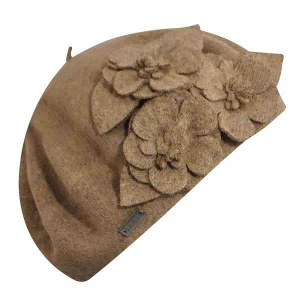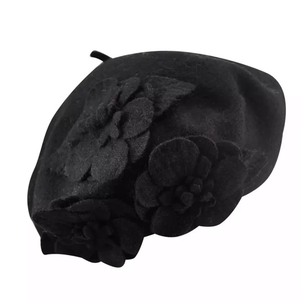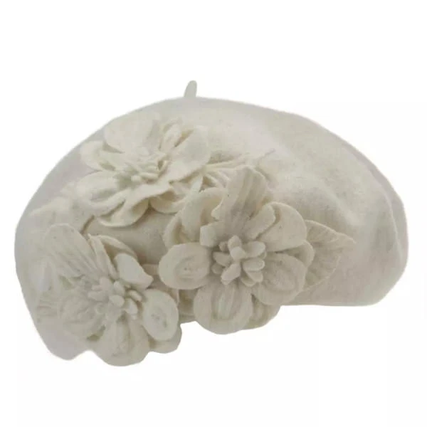 Sweet and elegant, this wool beret is trimmed with gorgeous felt flowers.