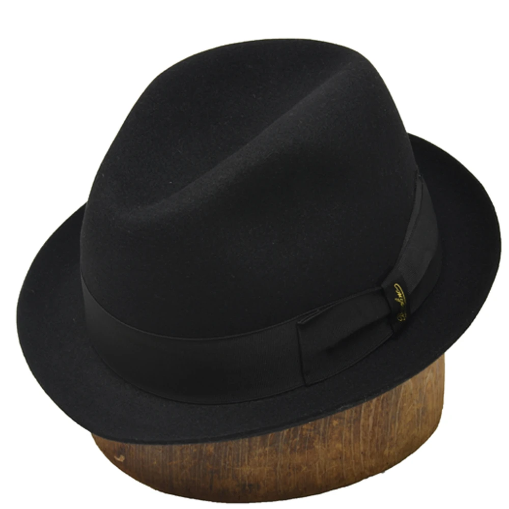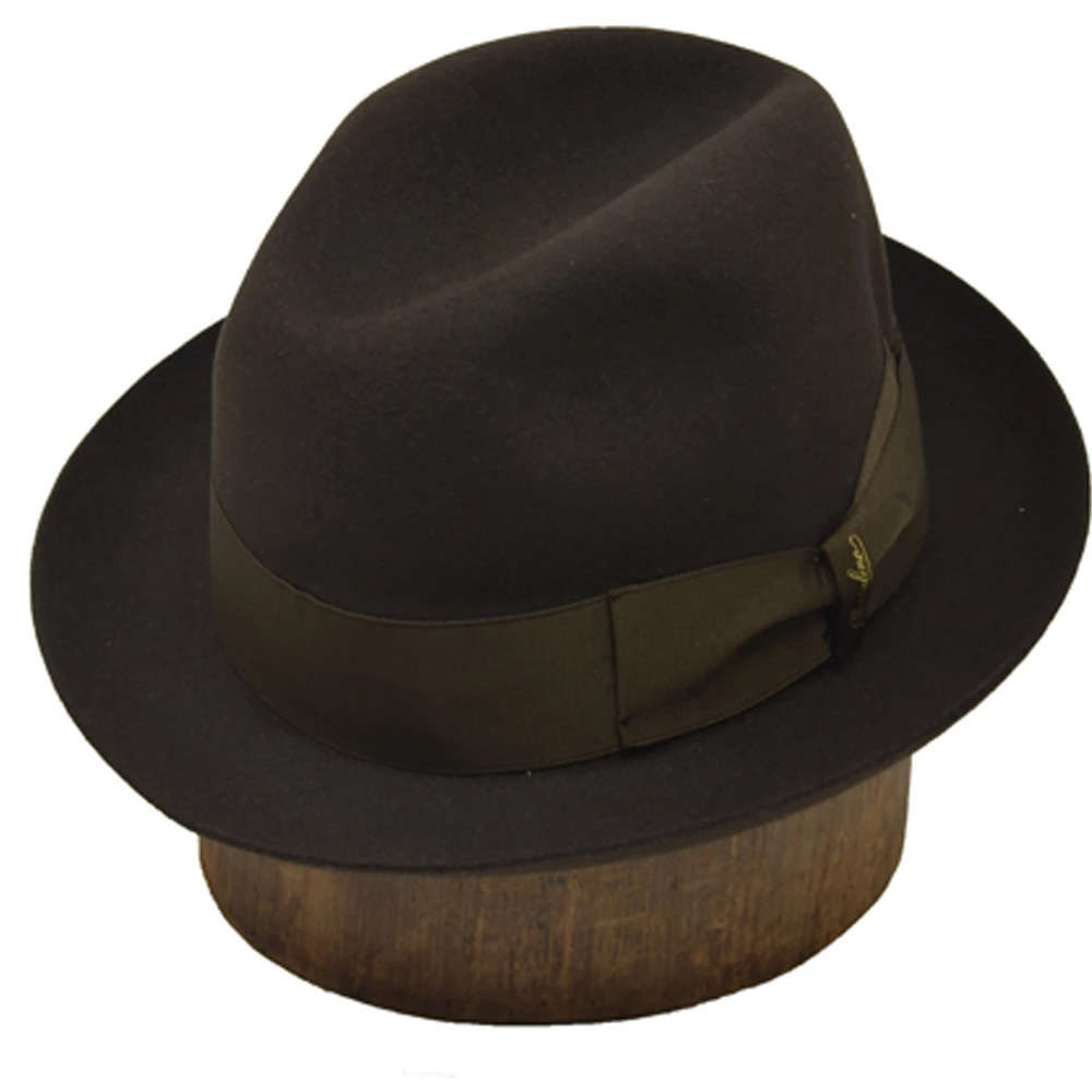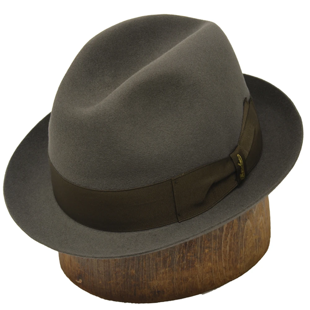 Borsalino Francesco Fur Felt Fedora Hat adds a new dimension to DelMonico Hatter’s offering of fine hats from the Italian Hat Maker. This fedora hat is Made in Italy and imported especially for DelMonico Hatter. Francesco is a soft-feeling fur felt hat with smaller brim and a more tapered crown. The brim measures 1 7/8″ and is finished with a plain edge. The tapered crown measures 4″ at the front. Borsalino Francesco has a full satin lining, a leather interior sweatband and a grosgrain hat band. The Borsalino name is discreetly embossed in gold on the bow of the hat band. Many people call this hat the Sinatra style, we prefer to call it Francesco.