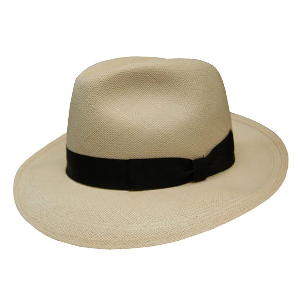 The DelMonico Bahia Panama Fedora by Tesi is a fine grade 7 quality genuine panama hat, hand woven in Ecuador by skilled artisans and formed into a classic centerdent fedora shape in a clean, natural straw color perfect for summer. This hat has a 2 3/4 inch brim which is trimmed with a line of stitching to retain shape. The interior 4 1/4 inch crown is also coated at the pinch to prevent cracking. A traditional black ribbon hat band keeps the look timeless, and the interior satin sweatband makes this one of the most comfortable straw hats available. This hat is also available in a 2 1/2 inch brim. Hand-finished in Italy especially for DelMonico Hatter by the quality Florentine Hat Maker Tesi.