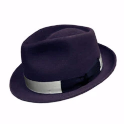 The DelMonico Blues Fur Felt Fedora is a jazzy hat made in Spain specifically for DelMonico Hatter from high quality 100% fur felt, blocked with a deep 4 1/4 inch high teardrop crown. The short 1 1/2 inch brim can be snapped down or worn up, giving the hat a modern look that can be easily dressed up or down. In deep rich navy blue or elegant aubergine, finished with a grey ribbon hat band and deep navy contrasting bow, this hat is a bold fashion statement. Lined in satin with a leather sweatband. Made in Spain.