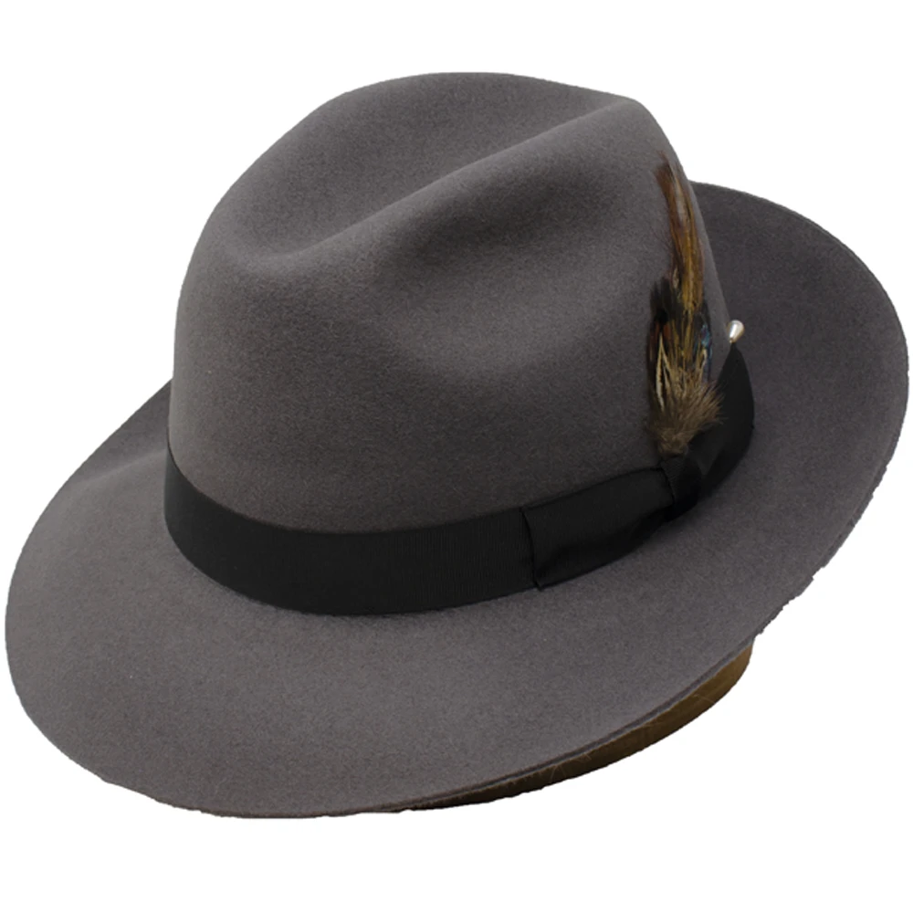The DelMonico Esquire Fur Felt Fedora by Capas is a classic fedora hat made from 100% fur felt. This fedora features a 4 1/2″ crown with centerdent, 2 3/4″ brim, grosgrain hat band with feather and pearl pin, leatherette sweatband, and full satin lining. Made in the Czech Republic.