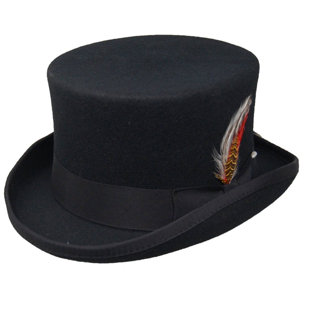 The DelMonico Wool Felt Top Hat is a handsome top hat made from 100% wool felt. This top hat features a 4 1/2″ crown, grosgrain hat band with bow and pearl pin, 2 1/2″ brim with bound edge and curl, satin lining, and leatherette sweatband. Made in China for us by Capas Headwear.