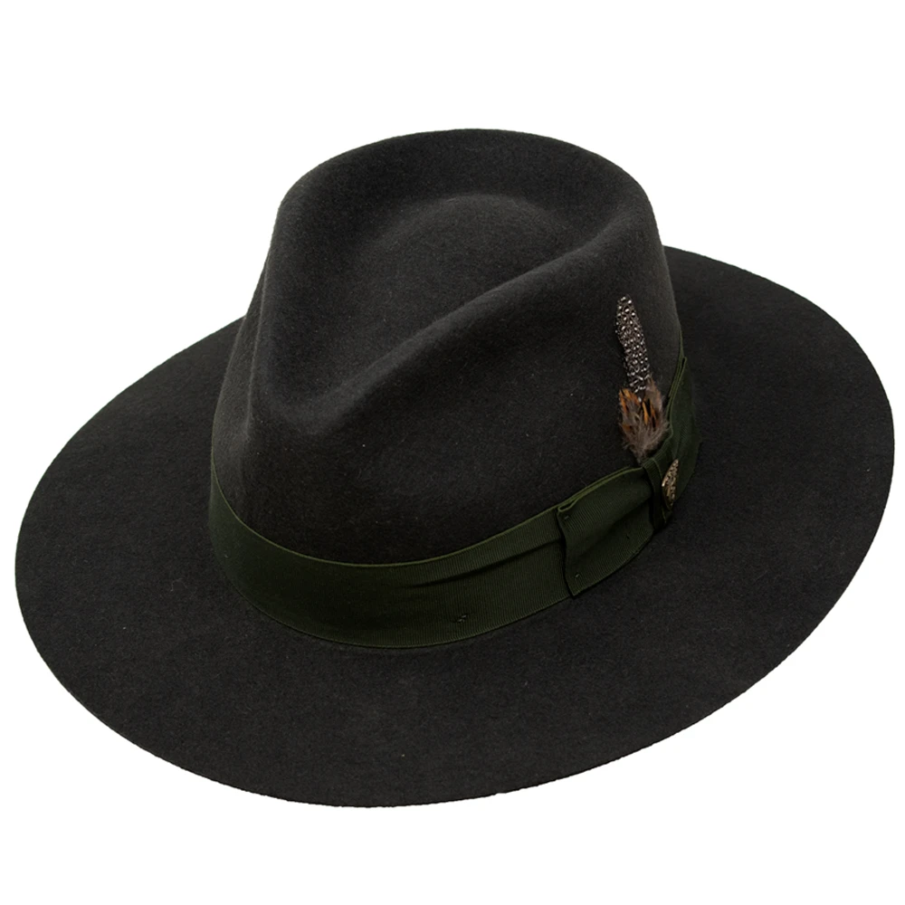 The Dobbs Estate Wide Brim Wool Felt Fedora is a cool and stylish fedora hat made from 100% wool. This fedora features a 4″ teardrop crown, 3″ flat brim, cowhide sweatband, and interior satin lining. Made in the USA.