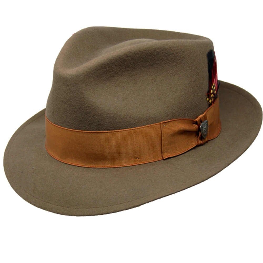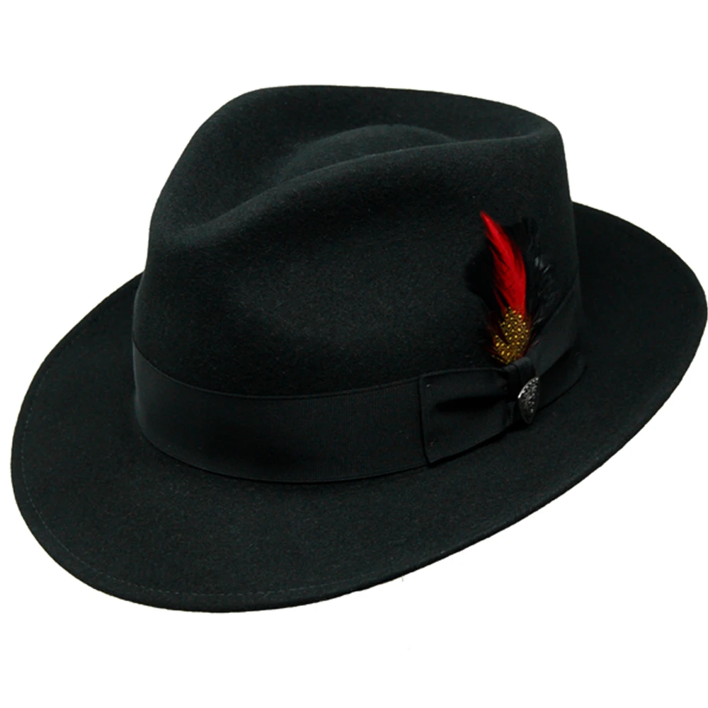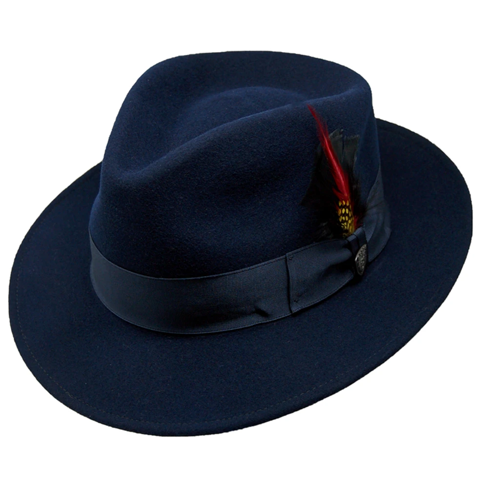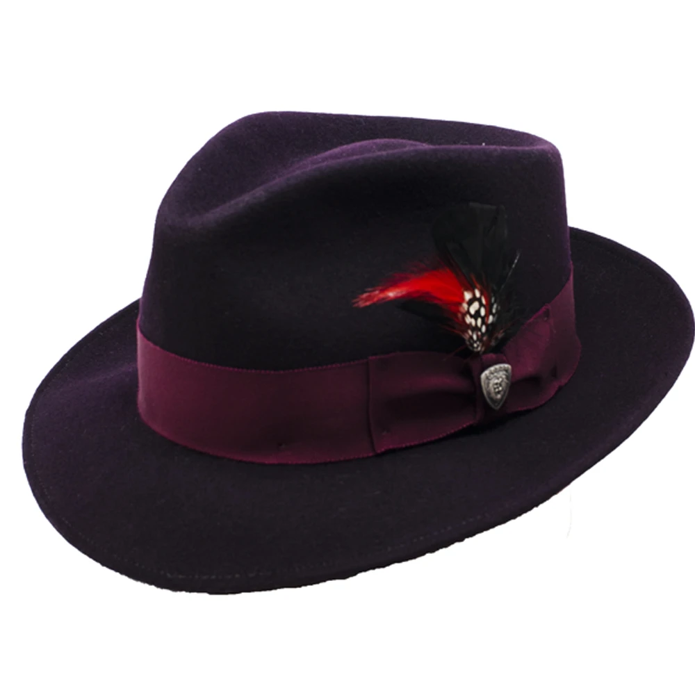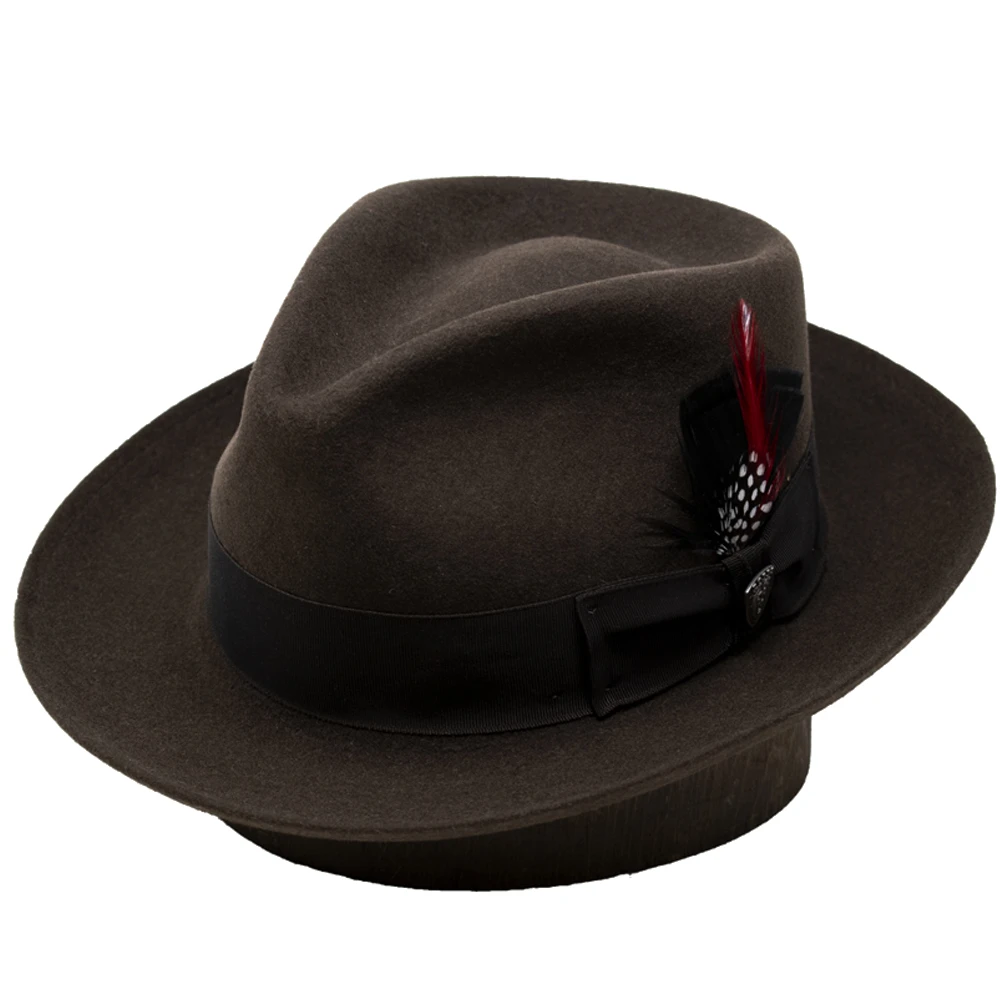 The Dobbs Strand II Fedora Hat is a sharp looking wool felt hat with a teardrop crown and flattering 2 1/2 inch brim. In rich shades with matching grosgrain ribbon hat band, this fedora comes with removable Dobbs pin and feather. The interior is lined in satin with a leather sweatband for a smooth, comfortable fit. Made in the USA.