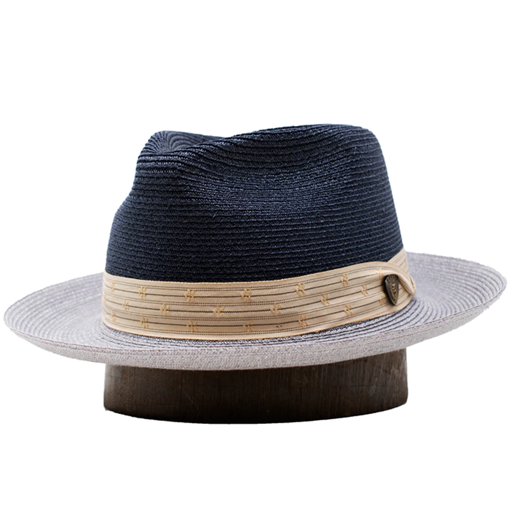 The Dobbs Valencia Hemp Fedora is a clever two-tone hat with a unique look for summer. The firm, durable woven hemp is dyed with a darker 4 1/2 inch high teardrop crown and a lighter 2 1/2 snap brim. The band is a tonal striped ribbon with subtle print detail finished with a Dobbs crest pin. The interior of the hat is unlined, with a fine quality leather sweatband. Made in the USA.