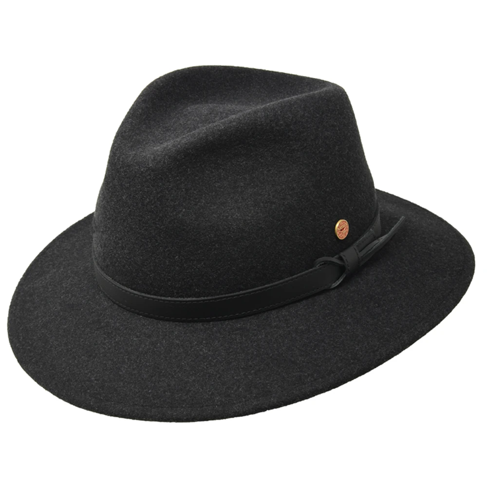 The Mayser Marvin Crushable Downbrim Wool Felt Fedora is a warm and functional downbrim fedora made from 100% wool. This hat features a 4″ pinch-front crown, 2 3/8″ by 2 5/8″ dimensional brim with underwelt, leather hat band, unlined interior, and comfort sweatband. Crushable, rollable, and water and wind resistant. Designed in Germany, made in Slovakia.