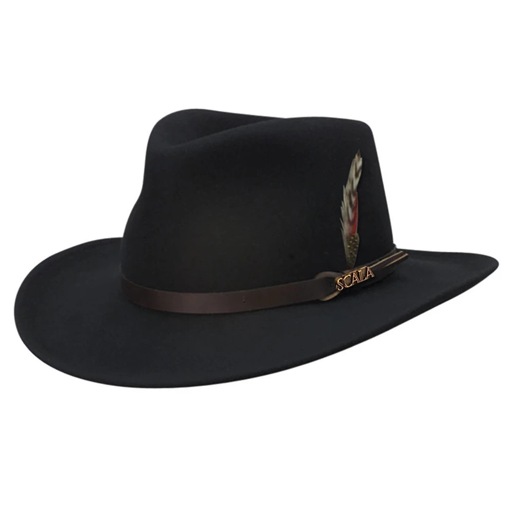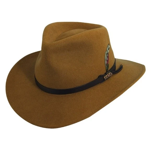 The Scala Dakota Wool Felt Outback Hat is a bestselling outback hat made from 100% wool felt. The hat features a 3″ brim in outback style, vegan leather hat band with tails, unlined interior, and comfort sweatband. Crushable, rollable, and water repellent – great for everyday use.