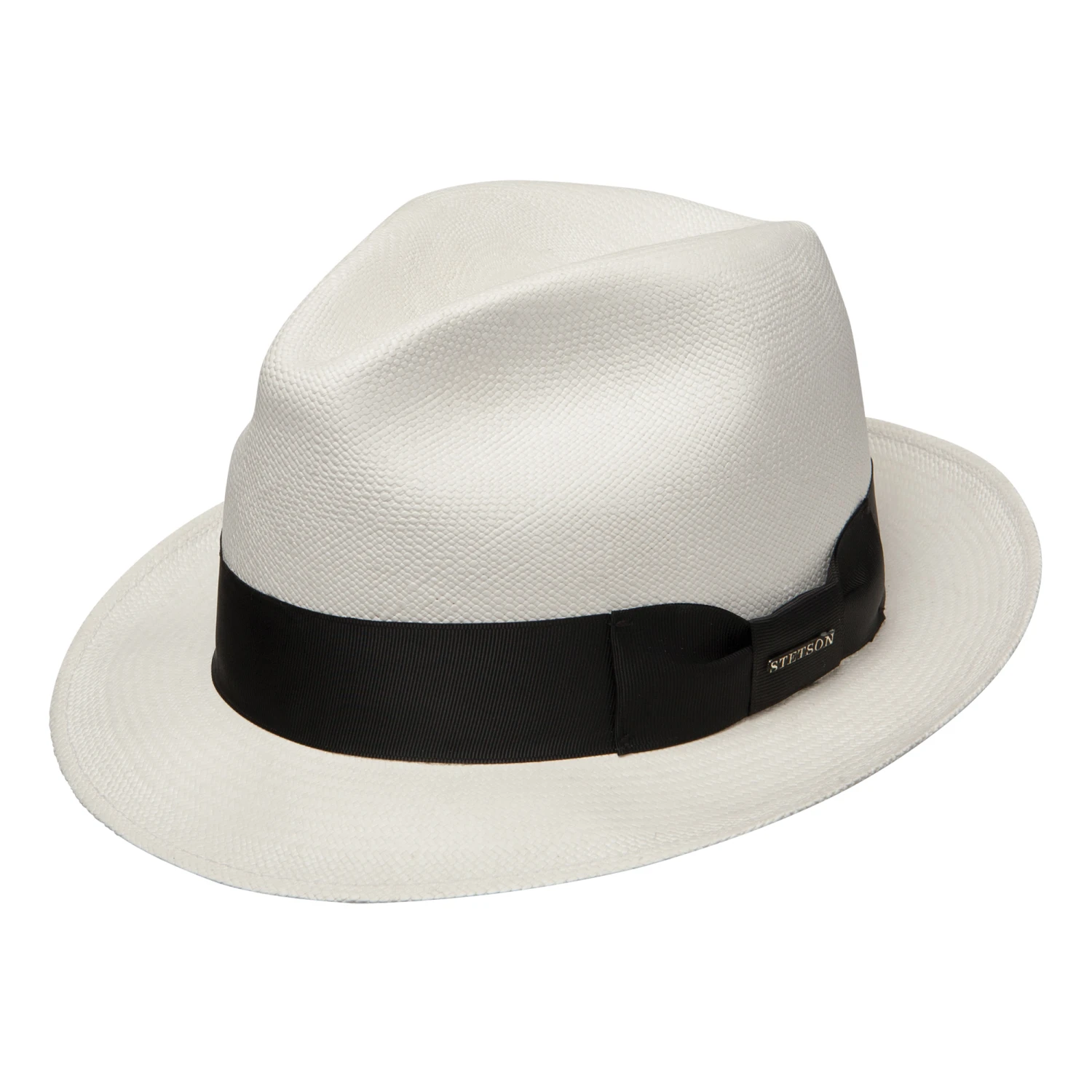 The Stetson Haberdash Shantung Fedora is a sharp summer hat made from smooth shantung straw, with a 4 inch high centerdent crown, sharply pinched in front for a structured look. The 2 inch brim can be snapped down in front, and there is a classic black ribbon band finished with a Stetson pin. The interior is unlined, with a cotton sweatband for a comfortable feel.
