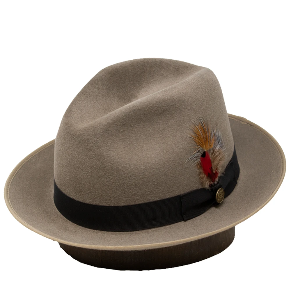 The Stetson Lamont Fur Felt Fedora is a centerdent fedora with a 2 1/8″ bound-edge brim. Finished with a clean grosgrain bow for a sleek, classic look. Made from Royal Deluxe quality firm fur felt with brushed finish. This stylish hat is a great way to dress up your fall or winter wardrobe! Made in the USA.