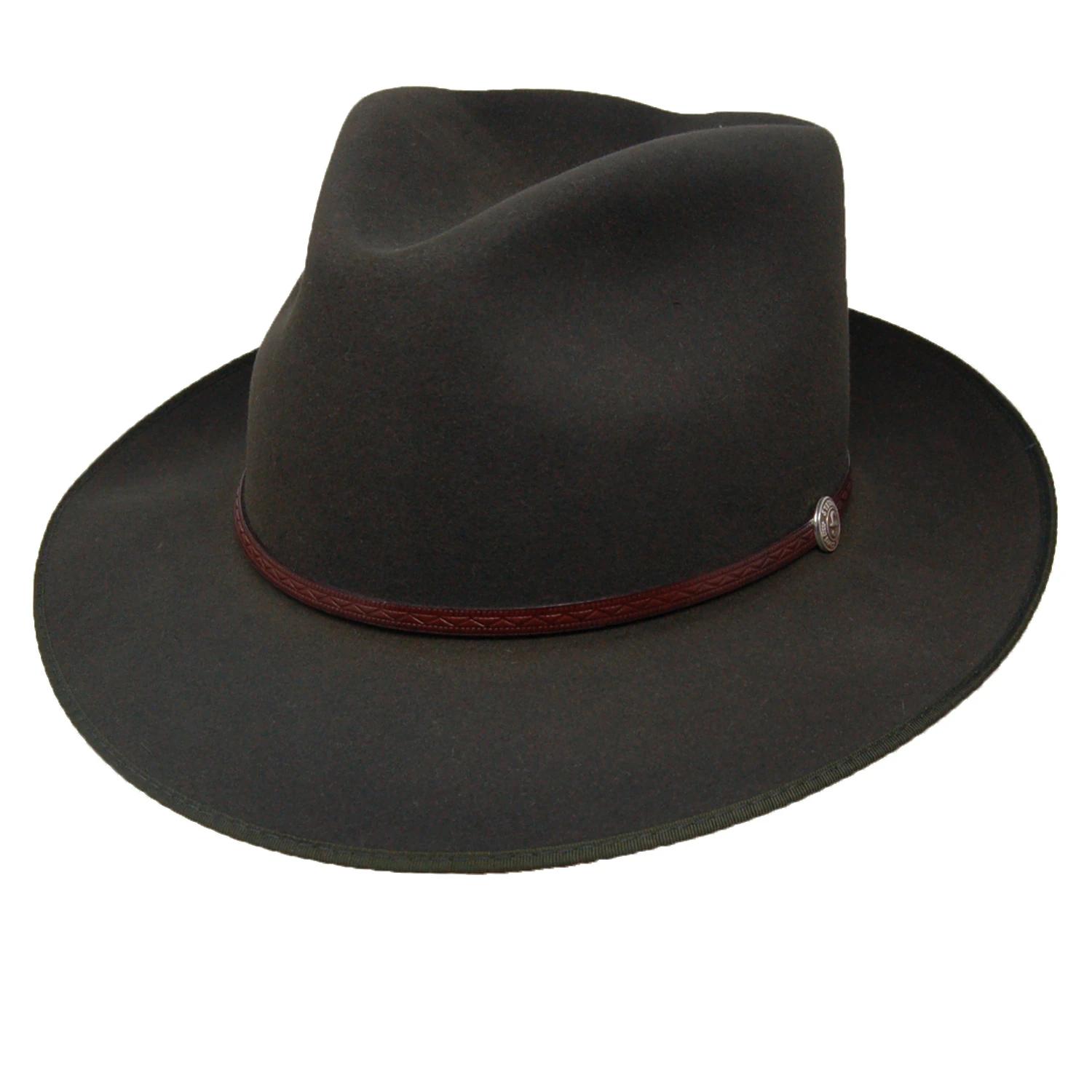 The Stetson Roadster is a classic fedora from the Royal DeLuxe line of fur felt hats. This fedora features a 2 1/2″ brim with bound edge, a 4″ pinch-front crown, genuine cowhide sweatband, decorative leather hat band with pin, and interior lining. This dress fedora has a country and western feel. Comes with Stetson hat box. Made in the USA.