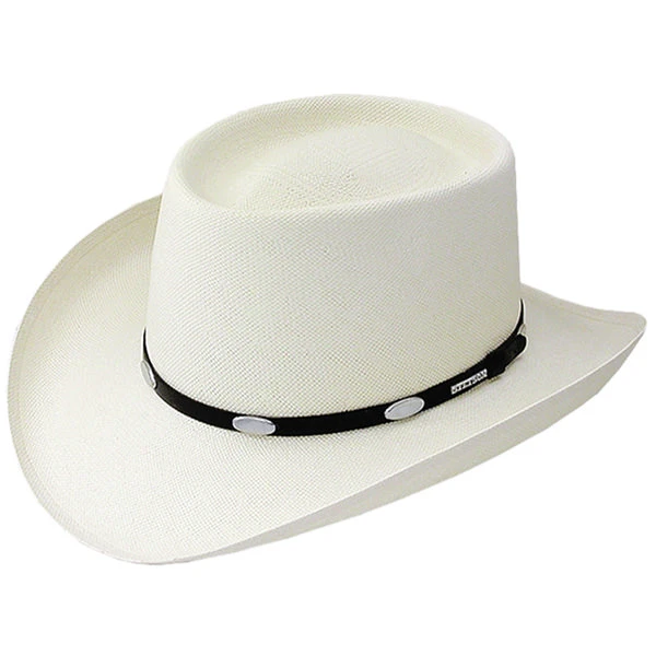 The Stetson Royal Flush Straw Hat is a warm weather version of the popular Royal Flush Gun Club Hat, made from smooth 10x shantung straw that is perfect for summer. The 3 7/8 inch gambler crown is a classic look paired with the curved 3 inch Western brim. The slim black hat band is finished with silver oval medallions for the finishing touch. Made in the USA.