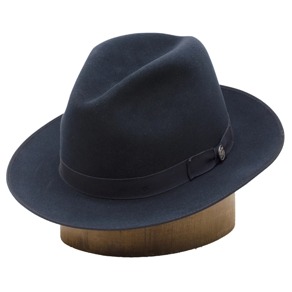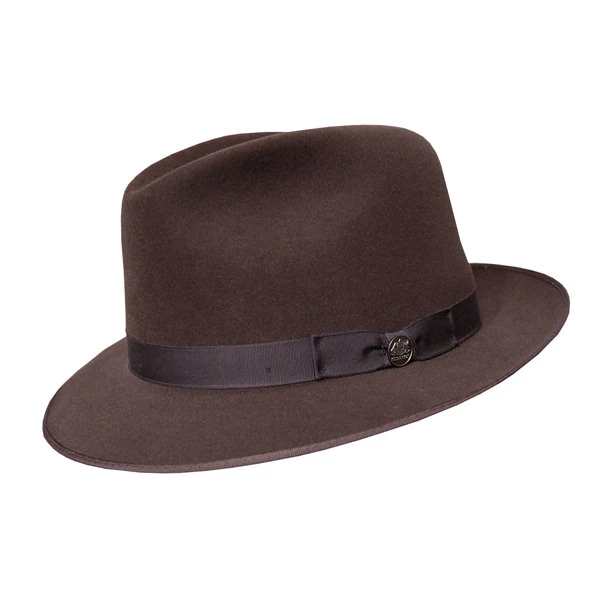The Stetson Runabout Packable Fedora Hat is a handsome hat with a hidden secret. This soft, smooth fur felt fedora with a centerdent crown and 2 1/4 inch finished edge brim is packable and rollable for compact, easy storage perfect for travel. The hat is flexible, with an unlined interior and fine quality Vom Bauer fabric sweatband, ideal for taking along to look good anywhere you go. The hat pops back into perfect shape when it is unpacked. With a simple grosgrain hat band and removable Stetson pin, this sophisticated hat is a fashionable look perfect for any occasion. Made in the USA.