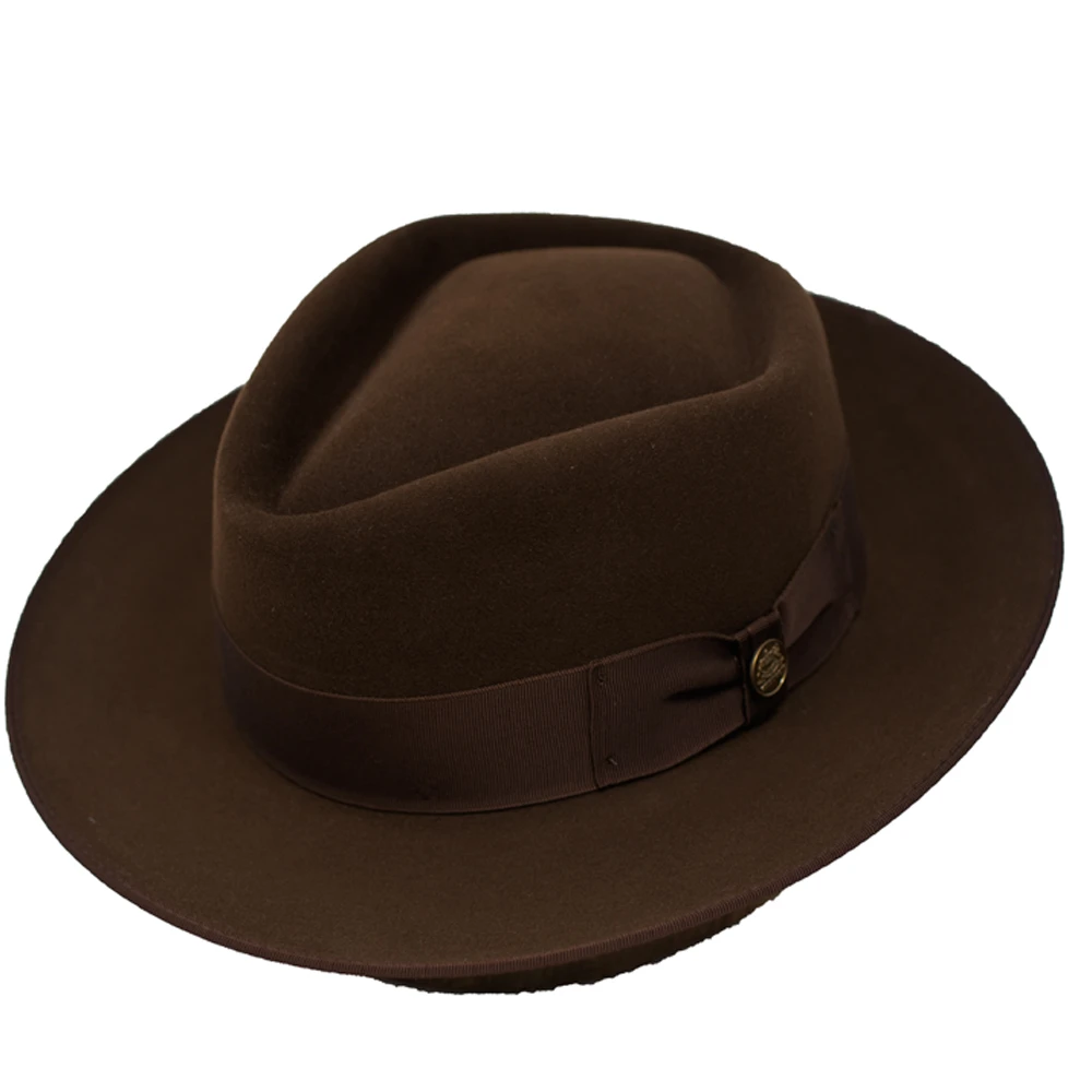 The Stetson Steinbeck Fur Felt Fedora is a finely-made classic fedora made from Royal Deluxe Quality fur felt with soft silk finish. This fedora features a 4″ diamond crown, 2 1/2″ brim with bound edge, cowhide sweatband, interior lining, and grosgrain hat band. Made in the USA.