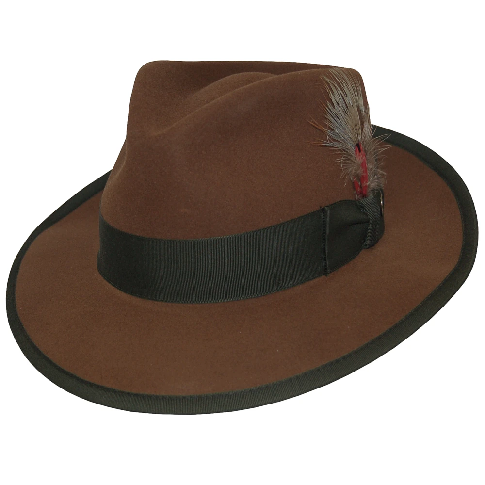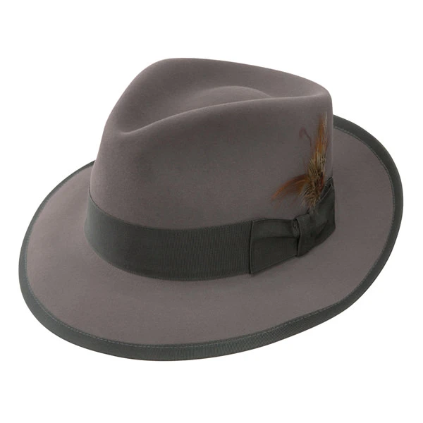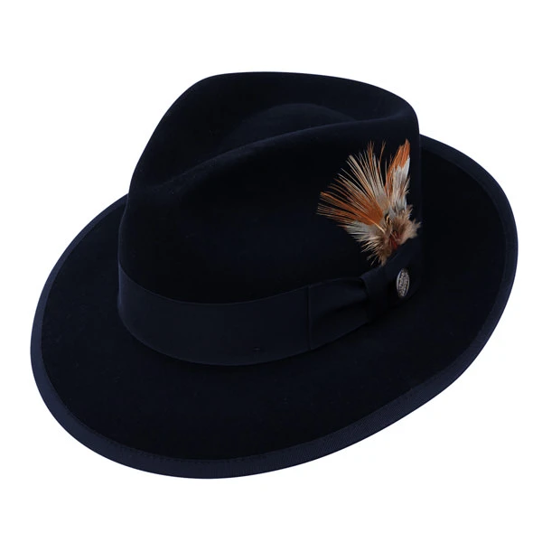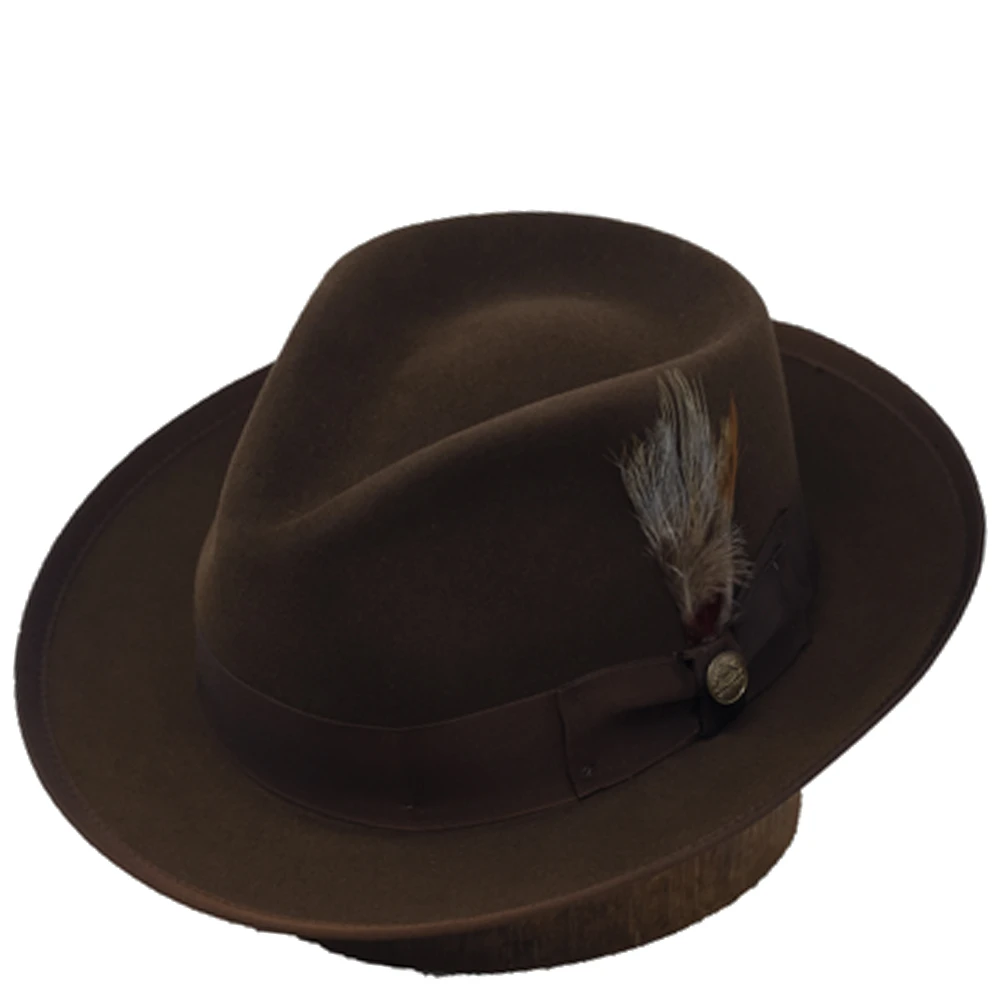 The Stetson Whippet is a Royal DeLuxe quality fur felt hat with vintage style. This fedora features a 2 3/8″ brim with bound edge, a 4 1/2″ teardrop crown, genuine roan sweatband, grosgrain hat band, interior lining, and removable feather and pin. A classic hat with a timeless look, comes with a Stetson hat box. Made in the USA.