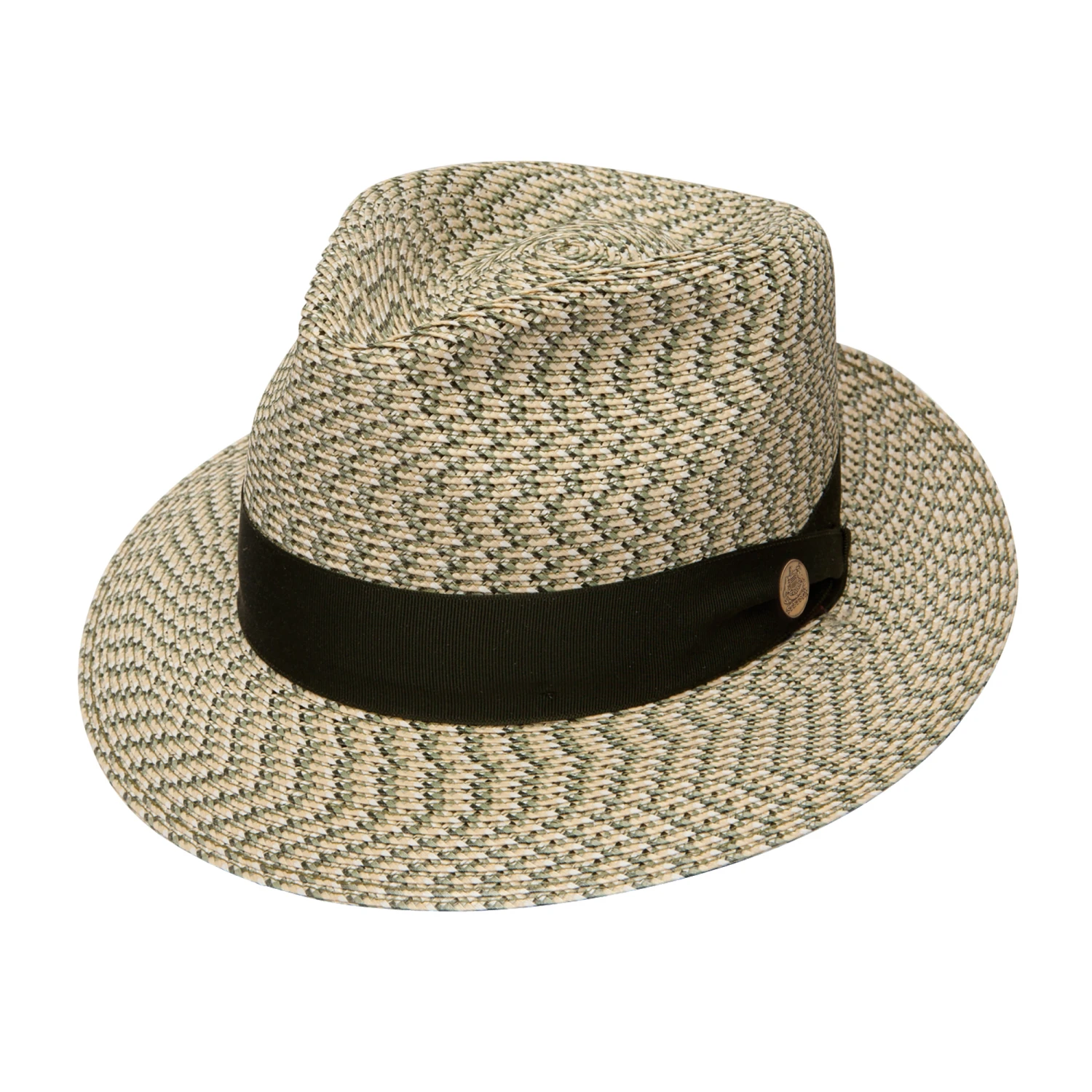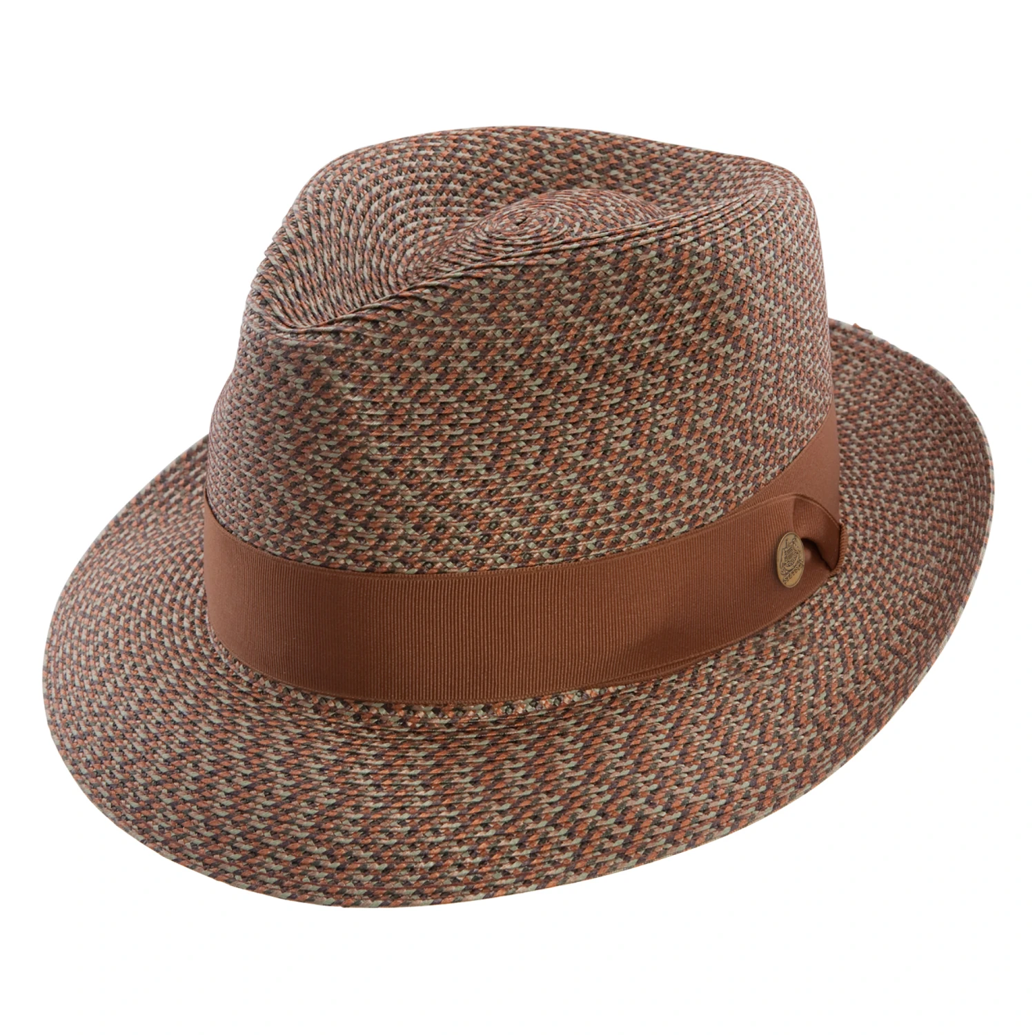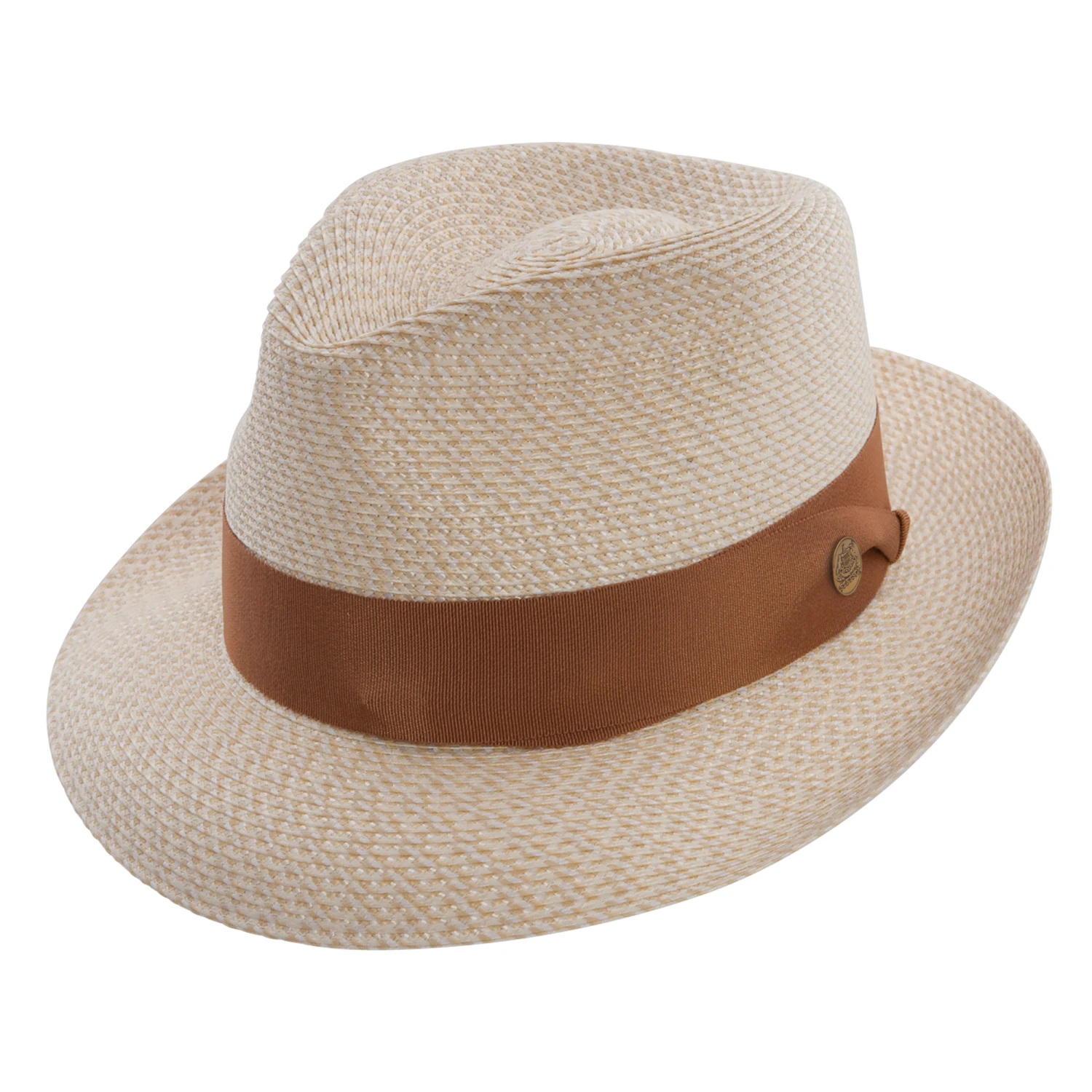 The Stetson Whitehall Milan Straw Fedora is a sharp look for summer, made from a mixed-dye Florentine Milan straw in a firm finish for a sturdy feel. The 4 1/2 inch high teardrop crown meets a 2 1/8 inch snap brim and is wrapped in a soft grosgrain ribbon band finished in a neat point topped with a Stetson pin. The interior boasts a smooth leather sweatband for a luxurious feel. Made in the USA.